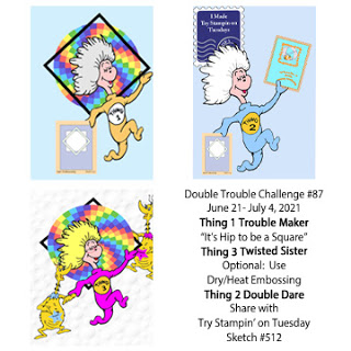 I'm still having fun using up the fun backgrounds I made using Cosmic Shimmer Pixie Sparkles. (Check out previous cards here and here). Double Trouble is partnering with Try Stampin' on Tuesday #512. Here is my interpretation of this wonderful sketch: