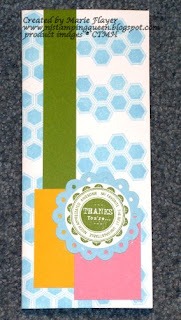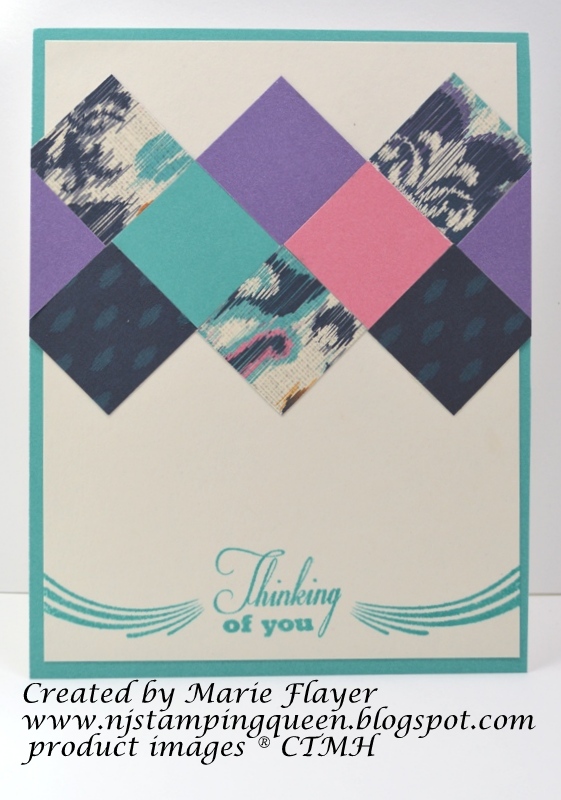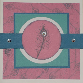 I love the Circle of Love Stamp set (D1438)! It has 2 greetings, 1 frame, 2 flourishes, 1 small heart, 2 focal images--feather and Peacock--a very versatile new set! Many CTMH new colors were used here also: Cotton Candy, Lagoon and Pacifica. Lagoon ink was used to stamp the feather stamp. Clear sparkles appear on the Pacifica stripe.