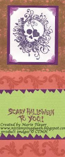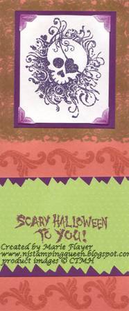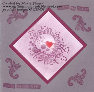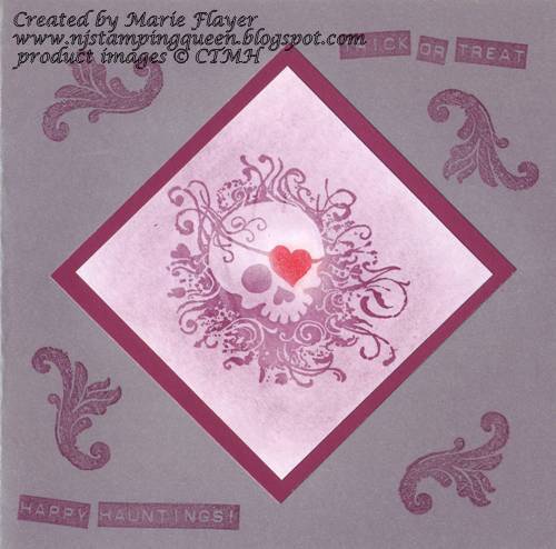 These cards were so much fun to make! I couldn't decide which one to enter in the H2H challenge this week so I'm posting all of my 2010 Halloween cards here. All of these cards were made with Close To My Heart "Thriller" stamp set which was the September Stamp of the Month set. The first card uses Grey Wool and Vineyard Berry Ink. The skull was stamped on white with Versamark ink and then chalked with vineyard berry chalk.
