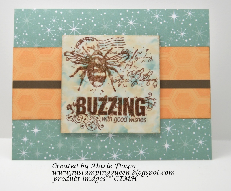 My card uses a Juniper colored patterned paper from Jingle which was available several years ago, Creme Brulee CS, a thin Cocoa CS stripe, Quick Cards--Bumblebee stamp, Cocoa ink, Versamark ink, Clear Embossing Powder, Creme Brulee ink with honeycomb stamp from Wicked stamp set (CTMH retired) and glossy paper (retired CTMH).  3D Foam Tape lifts the focus panel from the center panel.