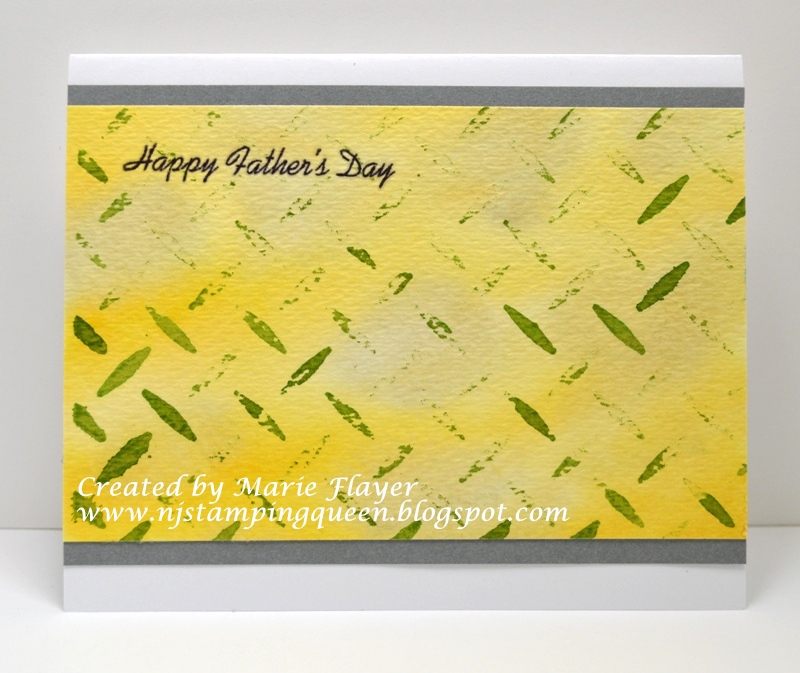 First I wet the watercolor paper with water. I placed acrylic blocks onto the Grey Wool and Golden Ember stamp pads and spritzed with water for my "paint". I used a heat tool to dry the panel before I inked up the embossing folder with Topiary ink and then pressed the folder closed with the watercolor paper inside. Last I stamped Happy Father's Day in Black ink and then again with Versamark and Clear Embossing Powder. (This is so easy to do with the MISTI stamp tool!)