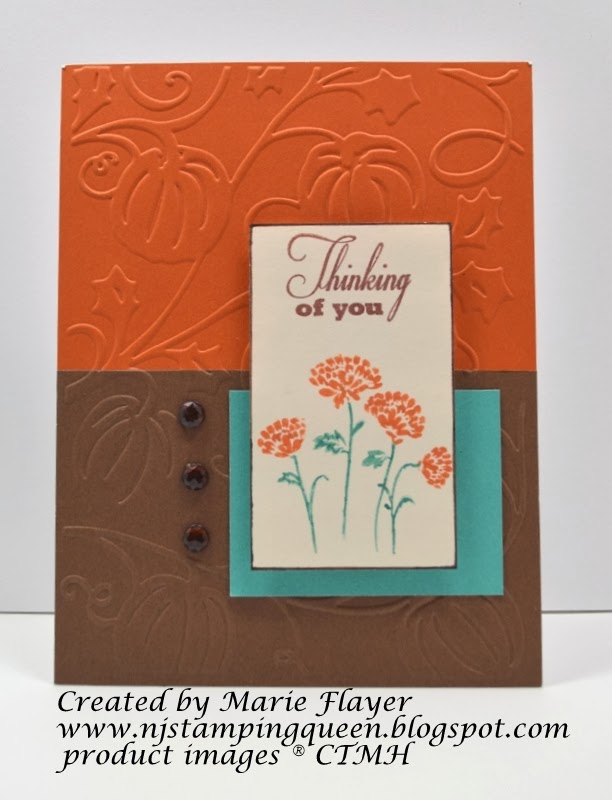 The stamps are from Casual Expressions and Happy Autumn stamp sets with Chocolate Ink, Autumn Terracotta and Lagoon markers onto Colonial White CS. After the background cardstock pieces were attached to the base it was run through the Cuttlebug machine with the pumpkin embossing folder. The greeting panel is raised up with 3D Foam Tape.