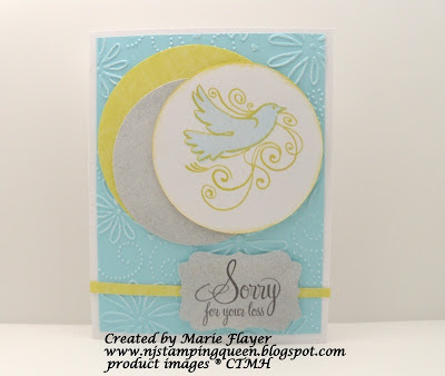 This card uses Close to My Heart retired colors Kiwi, Heavenly Blue and Grey Wool to closely match the Northridge Publishing January Challenge colors of Chartreuse, Aqua and Light Grey.  The bird is from CTMH "Blessed" stamp set (retired) and the greeting is from CTMH  "4 My Friend".  The Heavenly Blue panel was dry embossed with a Darice embossing folder called "Large Petal".  I am also entering this card into the Black Tie Friday#14 Condolence challenge.  It is also suggested from this site that we actually send the card to the Newtown, CT community at Messages of Condolence, P.O. Box 3700, Newton, CT 06470.