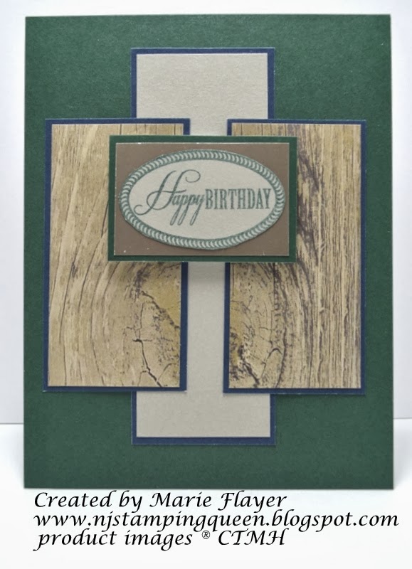 This card uses Ponderosa Pine, Outdoor Denim and Whisper cardstocks. The woodgrain panels are from Timberline. The stamp is from Casual Expressions Occasions in Ponderosa Pine ink. It is placed onto a small piece of platinum metallic CS (retired CTMH) and then raised off the card with 3D Foam Tape.