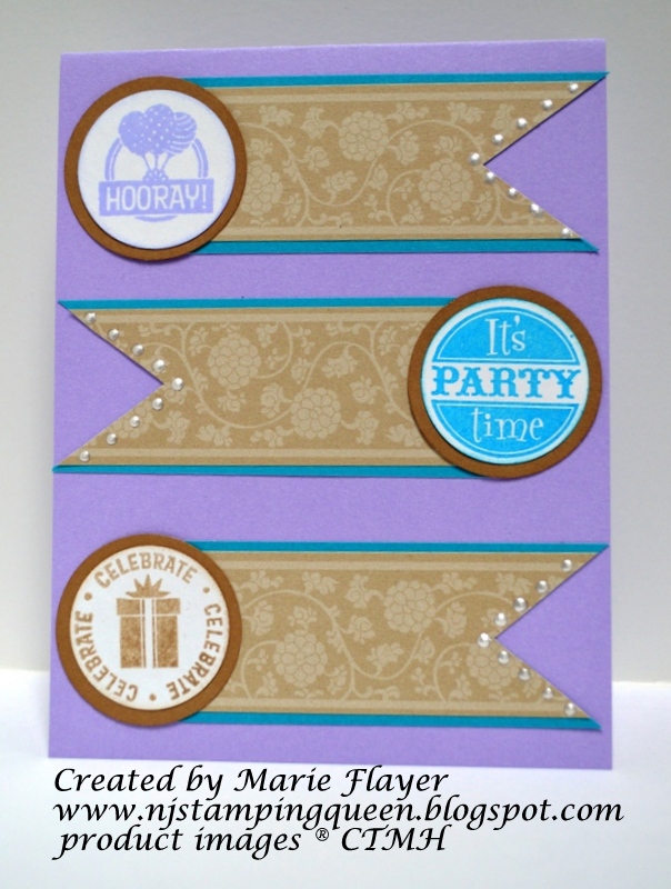 The greetings are all from Close To My Heart Perfect Fit--Birthday set. The patterned paper is retired Desert Sand Victorian paper. The ends of each banner were dotted with white Liquid Pearls.