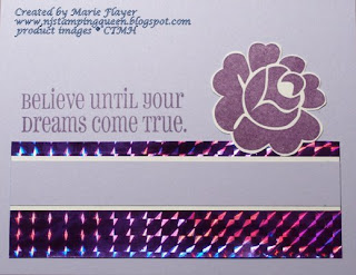 Create-A-Shade paint and then embossed the top corner with a stamp from CTMH called "Dreams Come True" (retired from CTMH) in Gold Tinsel Embossing Powder (retired from CTMH) and stamped the date using "Elegant Script" (retired from CTMH). I didn't have a photo to put in the frame so I stamped a greeting from Cloud9 Design Simple Thoughts--Wedding set. The gold rings are from a very old CTMH wood set. The paper is blue parchment (retired CTMH). Various sizes of