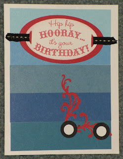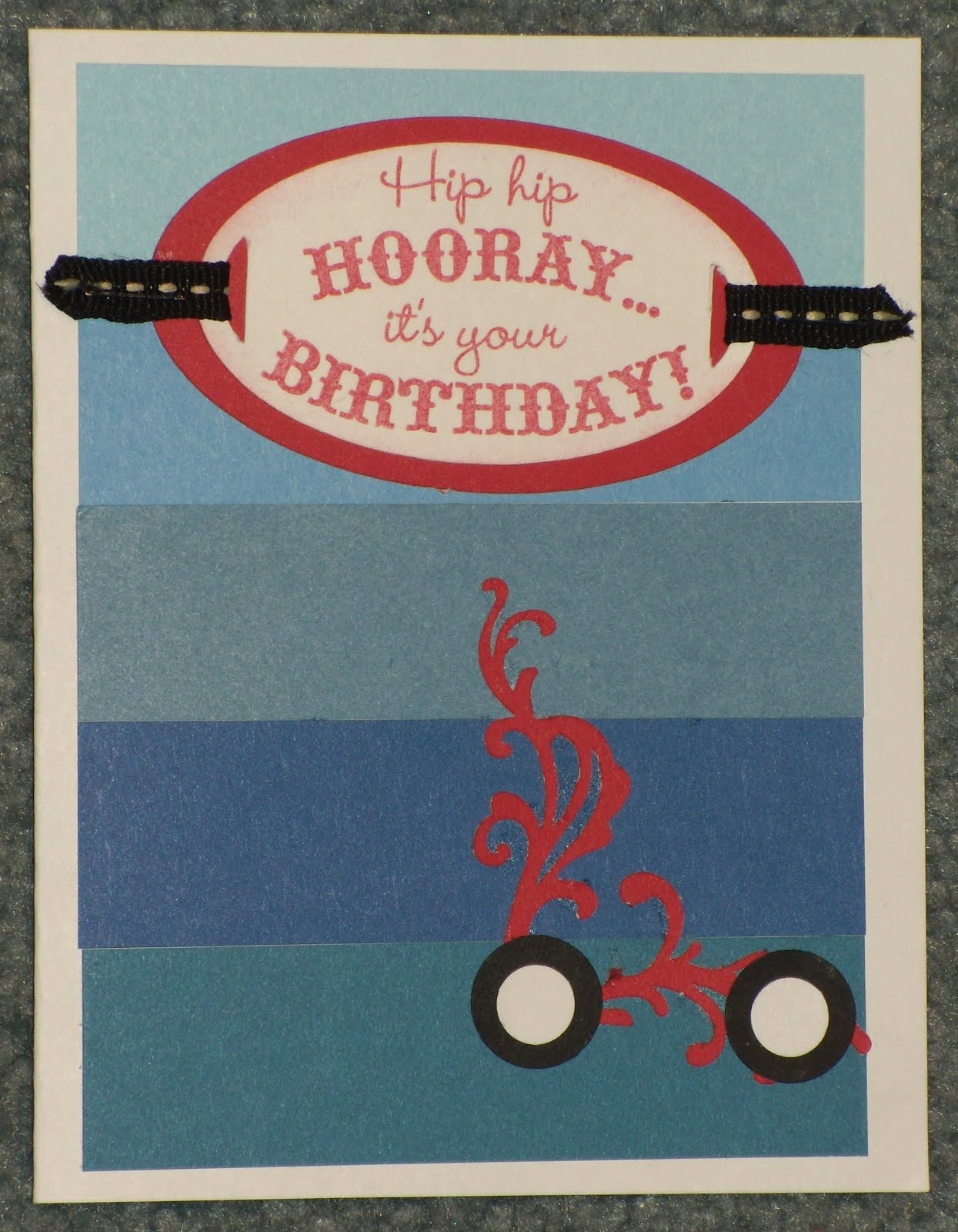 This is a "garage inspired card". After looking at the photo provided by the Inspired By blogsite I tried to capture the colors of the storage bins in my card. In order from top to bottom the colors are all from Close To My Heart--Sky, Dutch Blue, Indian Corn Blue, Moonstruck, Pacifica. I used a Cranberry flourish cut by CTMH Art Philosophy cartridge to imitate the bike in the photo. The ovals were also cut using the Art Philosophy cartridge and the greeting is from CTMH Card Chatter Birthday Set. I curved the edges of this stamp set and I like how it turned out.