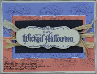 In my last post I showed a non-Halloween card made using the Close To My Heart August Stamp of the Month called Wicked. Today I'm posting a Halloween card using the greeting from the same set so you can look in the previous post to see what is included in the stamp set. For my design I used a pattern from the Wishes Card Confidence book which was card #2 in the Season's Greetings workshop with CTMH colors Colonial White, Sunset, Gypsy and Black. The greeting stamp fits perfectly into the "Shape 1" pattern from the new CTMH Art Philosophy Cricut cartridge. I used Gypsy ink for the greeting and Black ink to distress the edges of the card front and greeting. I used a background stamp from the Harvest Happiness (C1436) stamp set which is in the new catalog. The greeting is mounted over some raffia--doesn't it look as if it could have come from a witch's broom? Some of the paper edges were distressed with the distressing tool. This was a really simple card to do. I hope you've enjoyed checking it out and I hope that it inspires you to create cards that are fun for you too. Thanks for stopping by!