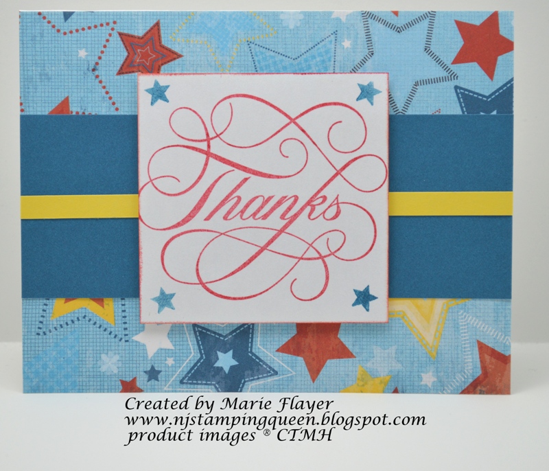Products used are from Close To My Heart: Fanfare paper (retired), Pacifica CS, Sunny Yellow (retired) stripe, Thanks stamp, Love Life small star stamp, Cranberry Ink, Pacifica Ink.