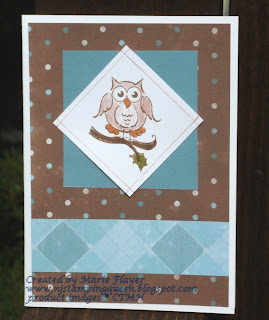 The above card features the new CTMH paper called Wonderland with a background square of Twilight CS. The image was stamped in chocolate ink and colored in with Chocolate and New England Ivy markers for the branch and leaves and then colored pencils for the owl.