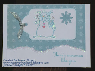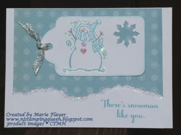The next card uses Miracle paper and the Art Philosophy Cricut cartridge. The snowman and greeting was stamped in Crystal Blue ink and was colored with pencils and then embellished with a glue pen and Prisma Glitter.
