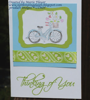 The bicycle card was inspired by the glittery ribbon that I found at a craft store. It matches the CTMH Pear CS and ink very well so I just had to use it! The shapes were cut with the Art Philosophy Cricut cartridge and is backed with Sky CS. The image was colored with pencils and the greeting comes from D1187 For Every Occasion.